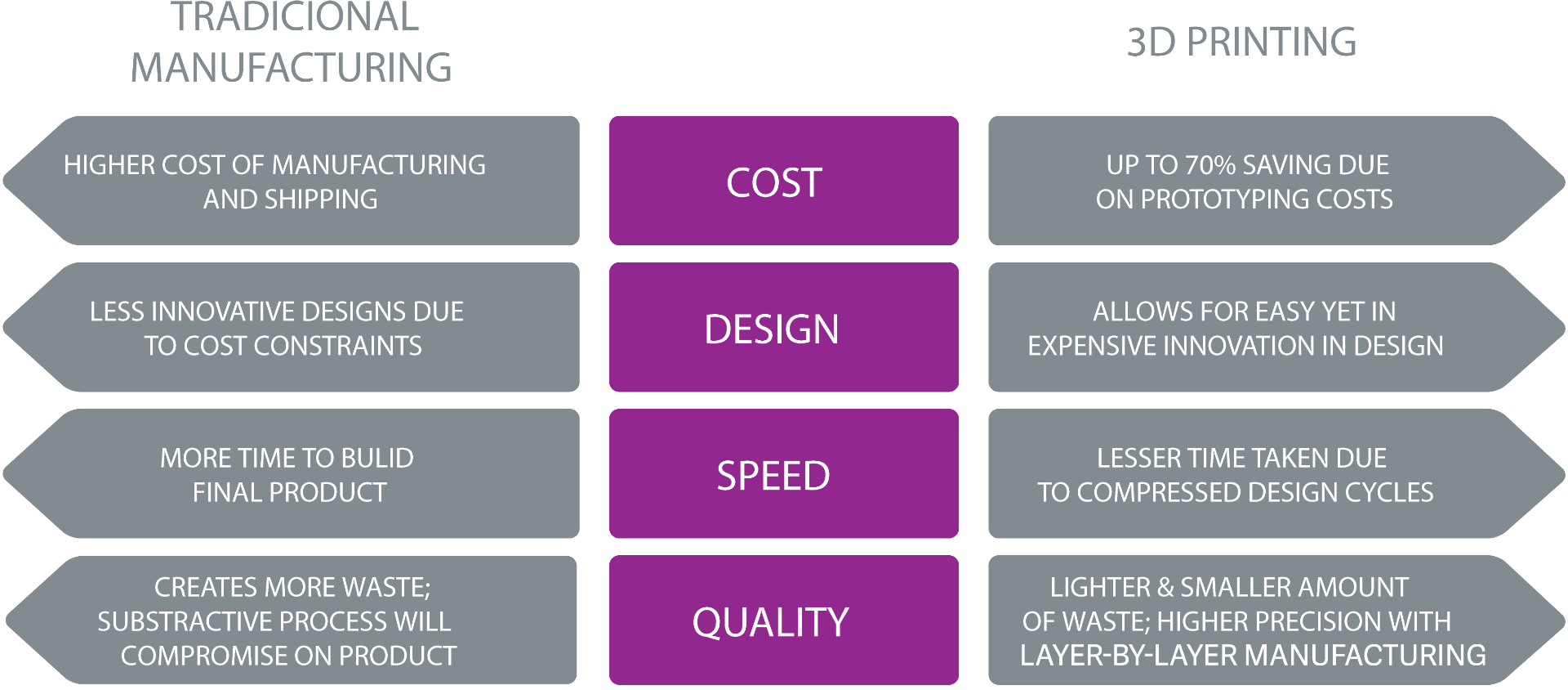 3D printing undoubtedly impacts the material and production cost in a production environment. However, in a large scale manufacturing setup, we are seeing an industry that has migrated aggressively to 3D printing to hit the break even point significantly quicker than integrating other technologies or improving the process.