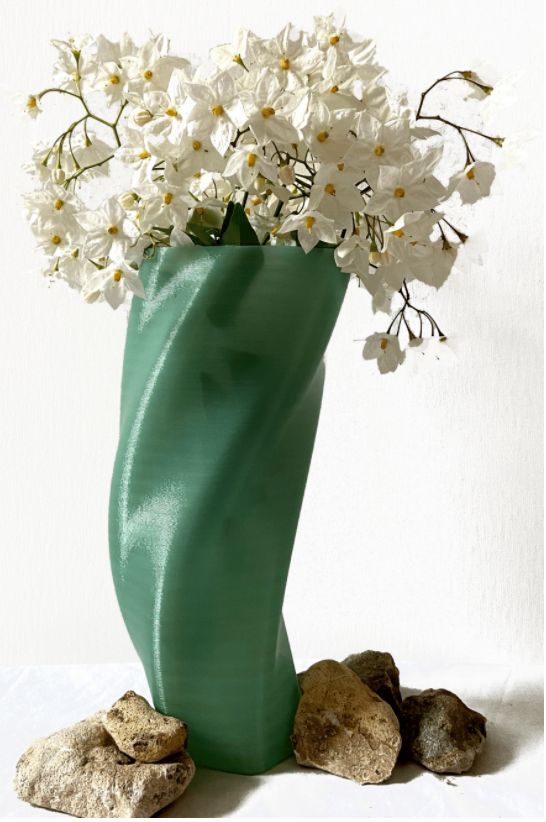Together, they decided to create a unique line of fashionable home furnishings called The Porthcurno Collection, named for the ‘Porthcurno’ blend of filament that it utilizes. The Porthcurno Collection combines a love for the ocean, sustainability, and modern technology in a series of limited-edition vase furnishings. Each vase is inspired by the natural movements of water, and captured in the jade tones of an entirely recycled material (100%).