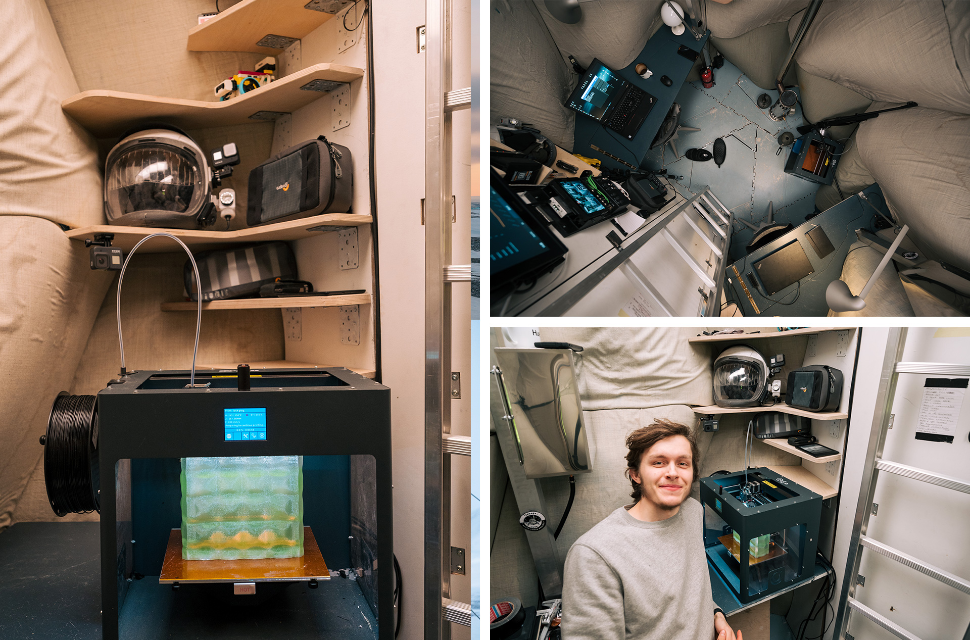 Within the unfolding pod concept, there is limited space and they had to make sure to add space for batteries, water and a living algae farm. There was no way for them to add more supplies without compromising the personal space of the astronauts. The question became: How can they maintain spare parts and repairs if anything were to go wrong? This was when, as a long time 3D printing enthusiast, Karl-Johan knew that this would play an important role in their success.