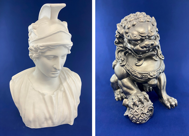He mostly prints the statues with PLA as most of his prints require support and with PLA it is easy to remove. PLA also sands nicely, a nice finish can be created with it.