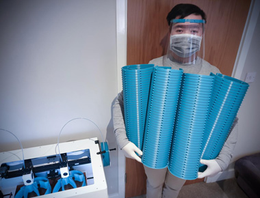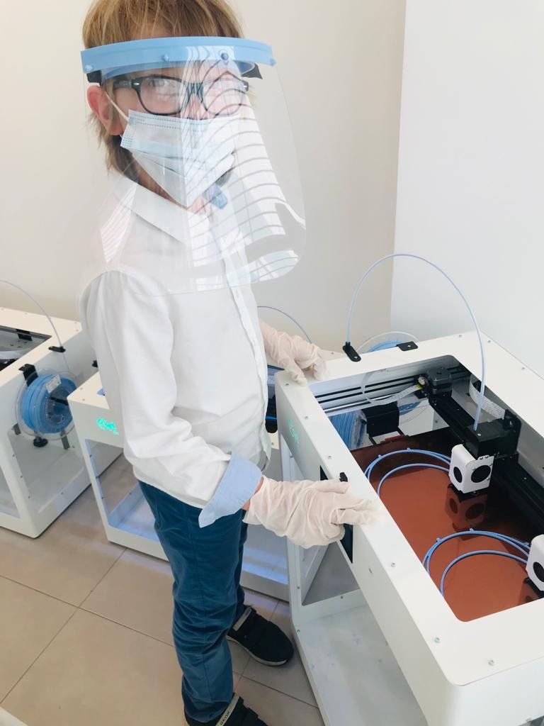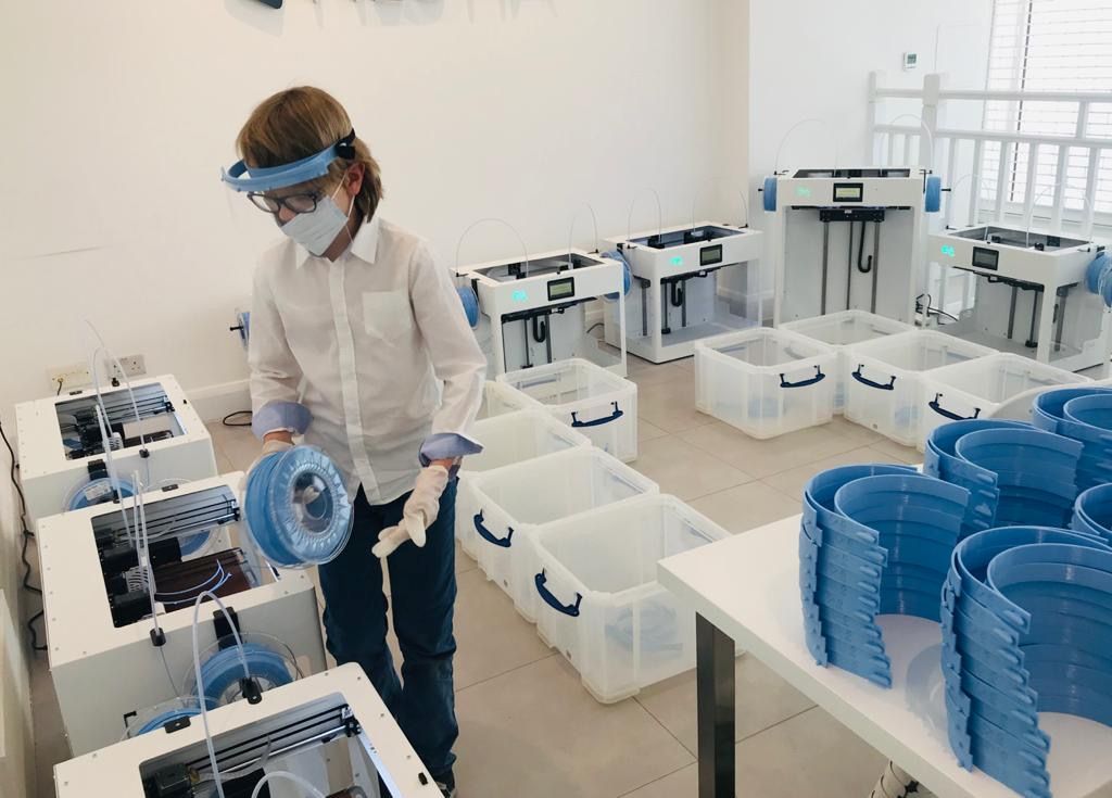 His mum helped him get the right materials, and friends and family donated money to help him buy more 11 3D printers so he could set up a printing farm in his living room to print continuously face shields – hundreds of shields weekly.