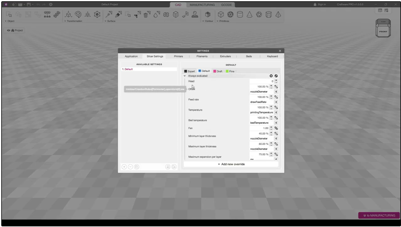 - Custom printing modes can be added as special Overrides in the printer