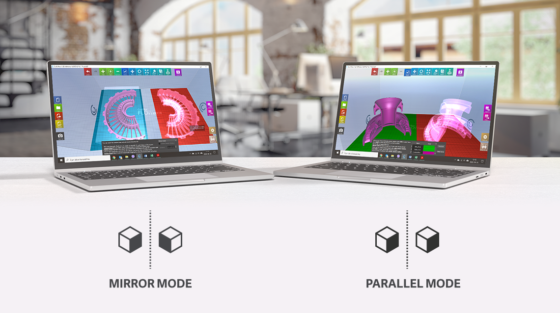 All you need to do is switch to either Parallel or Mirror mode, and the printer produces the exact copy or the mirrored side of a part on the other side of the bed, thereby increasing production efficiency.